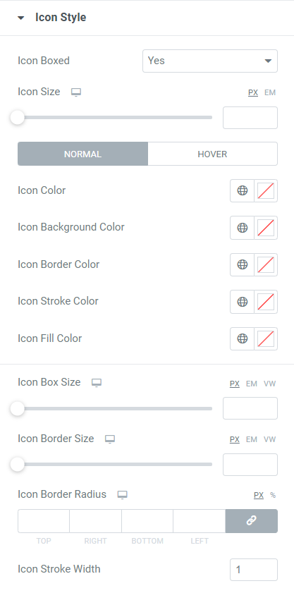 You can enable a boxed layout for the icons, set the size for the icons, and adjust color, background color, border color, stroke color and fill color for icons in both normal and hover states, as well as to input a value for the icon stroke width.