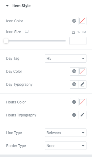 For each individual item you can add an icon or an SVG, name of the day, input the working hours, and set a color for the item.