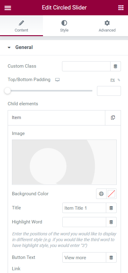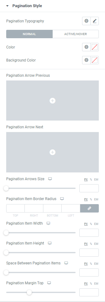 In this sub-tab you can customize the slider pagination. In order for these settings to become available, you first need to enable slider pagination from the content sub-tab General.