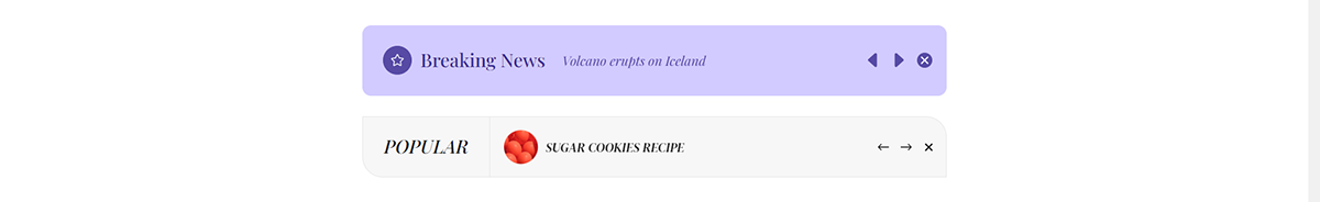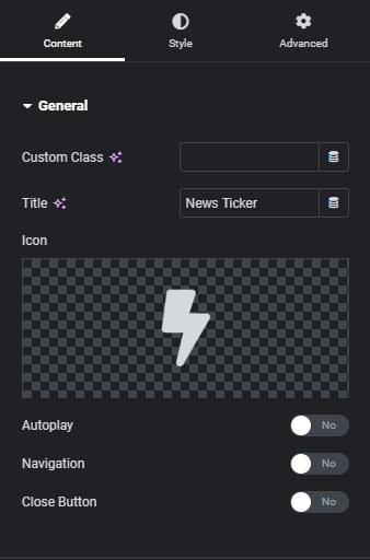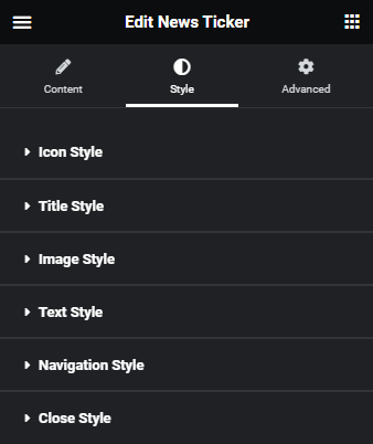 If you enabled the news ticker close button from the Content sub-tab labeled General, you can make adjustments to the close button here. You can set an icon you wish to use for the close button, choose whether you wish to make the close icon boxed, and in the event that you opt to do so, you can also set a background color, size border type, width, and radius.