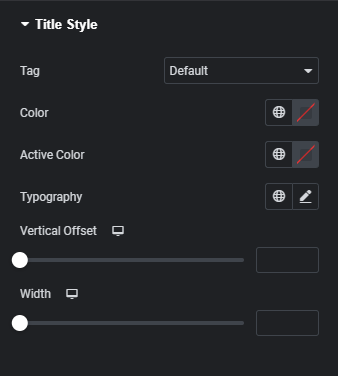 You can set a heading tag for the title text, set a text color, active color, adjust the title text typography, vertical offset, and width.
