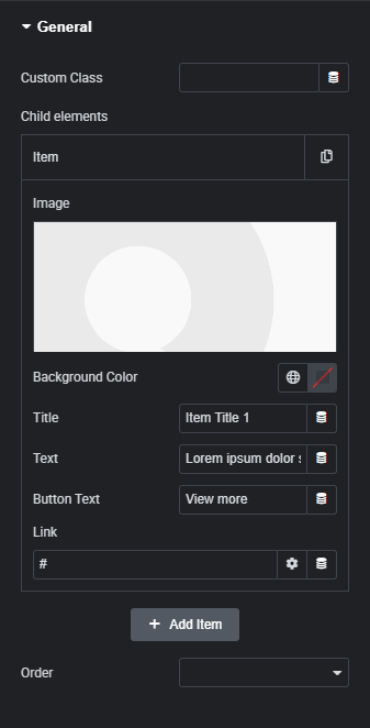 For each of the items you can add the image, adjust background color, input a title, add some textual content, input some text for the item button, and add an item button link.