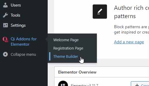 To access the Theme Builder, you should simply navigate to Qi Addons for Elementor > Theme Builder.