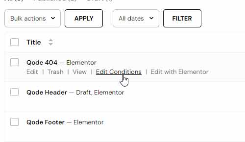 To manage this, simply locate the desired template in the list of templates found by navigating to Qi Addons for Elementor > Theme Builder, and click the Edit Conditions button which appears when a template is hovered over.