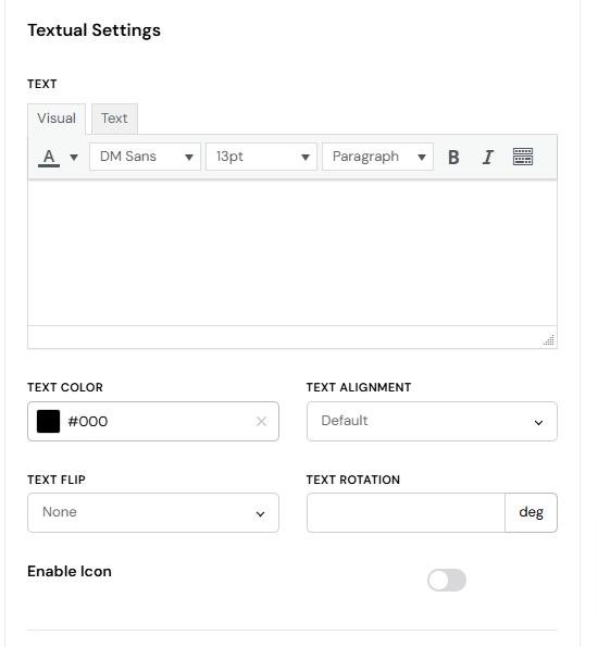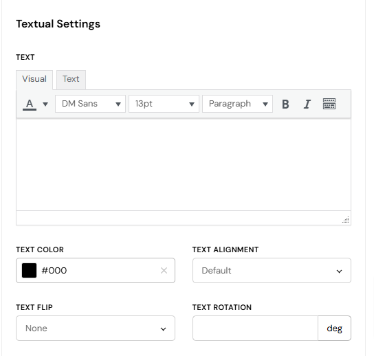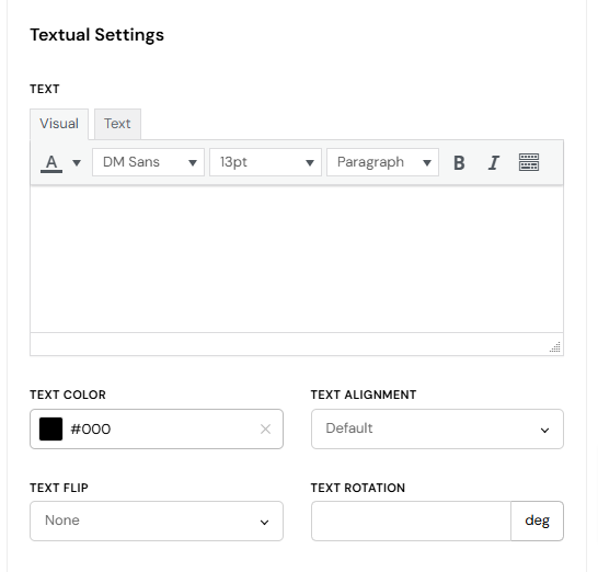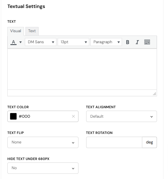 First off, you have the option to add the textual content you wish to display using either Visual or Text input fields.