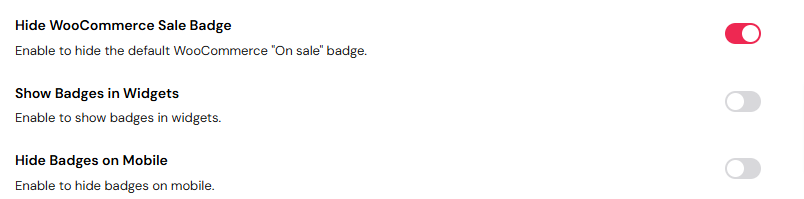 First off, this is where you can choose whether you wish to hide the default WooCommerce Sale Badge by default, and you can choose if you wish to display badges in widgets. In addition to this, you can also hide badges for users accessing your website from mobile devices.