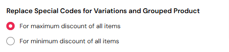 Next up, you can choose how you wish to replace special codes for product variations and grouped product types; you can either show maximum discount for all items, or minimum discount for all items.
