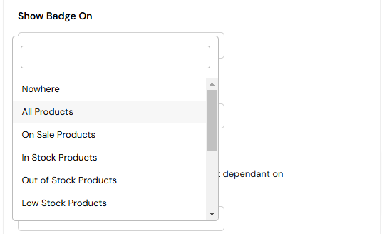 Following these settings, you can choose where you wish to display the badge affected by this rule. The badge can be either shown on all products, on sale products, in stock products, out of stock products, and low stock products.