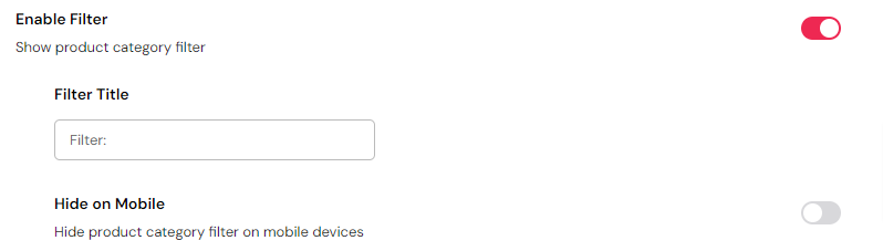 Next up, you can choose whether you wish to enable a product category filter for your tables. In the event that you enable this option, you can also input a title for the filter, and choose whether the filter stays turned on for mobile devices as well.