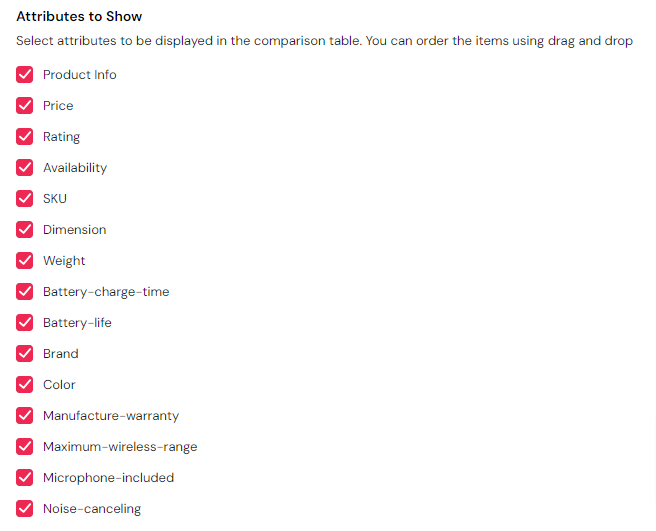Following this, you can choose which previously created product attributes you'd like to display in the table. You also have the option to rearrange the order of these attributes here by using drag & drop.