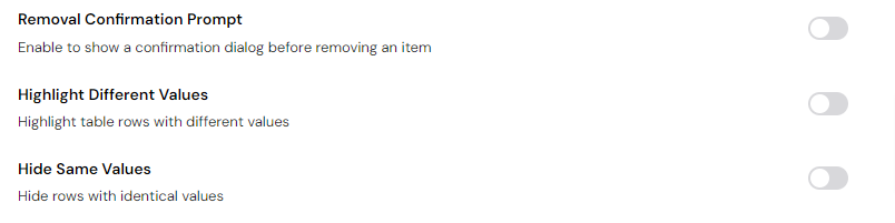 After this, you can enable a confirmation dialog prompt before an item is removed from the table, you can enable highlighting table rows with different values, and choose whether you wish to hide table rows with identical values.