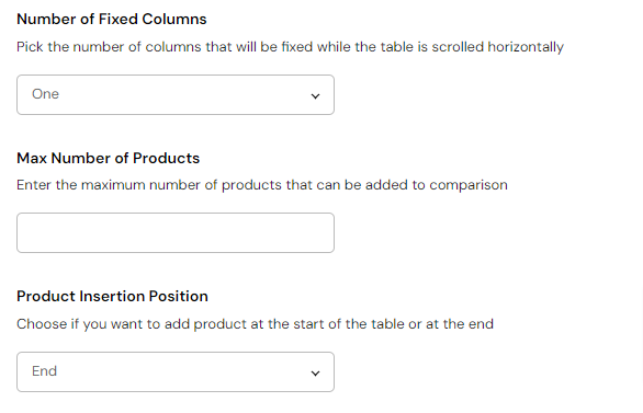 Finally, you can set a number of fixed table columns, adjust the maximum number of products per comparison table, and choose where in the table will the newly added products appear.