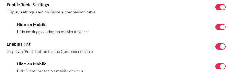 You can enable the table settings section in your tables, and choose whether they will appear on mobile devices as well. The same applies to the Print table button.