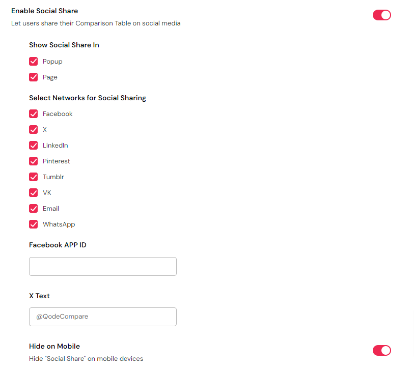 In the event that you enable social sharing, you can choose where this feature appears (popup tables, standard table pages or both), and select which networks you wish to enable the sharing for. This feature can also be optionally disabled for mobile users.