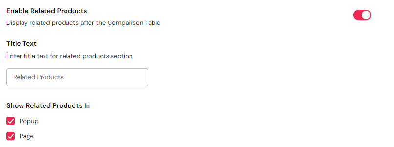 If this option is enabled, you can input a custom title for this section, and choose where you wish to display the related product sliders (popup tables, standard table pages or both).