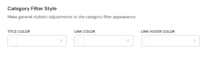 You can set a color for the category filter title text, and adjust link default and hover colors.