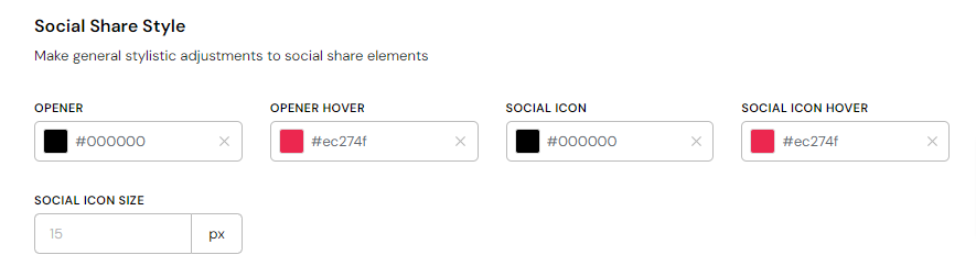 In the event that you enable the sharing feature, you can set an opener color, opener hover color, social icon color, social icon hover color, and social icon size here.