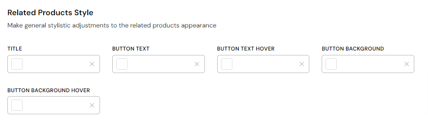 You can adjust the title text color, button text color, button text hover color, button background color, and button background hover color for the related products section.