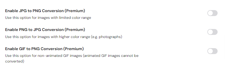 First up, you can enable JPG to PNG, PNG to JPG and GIF to PNG conversion. Note that the conversion only applies to non-animated GIF files.