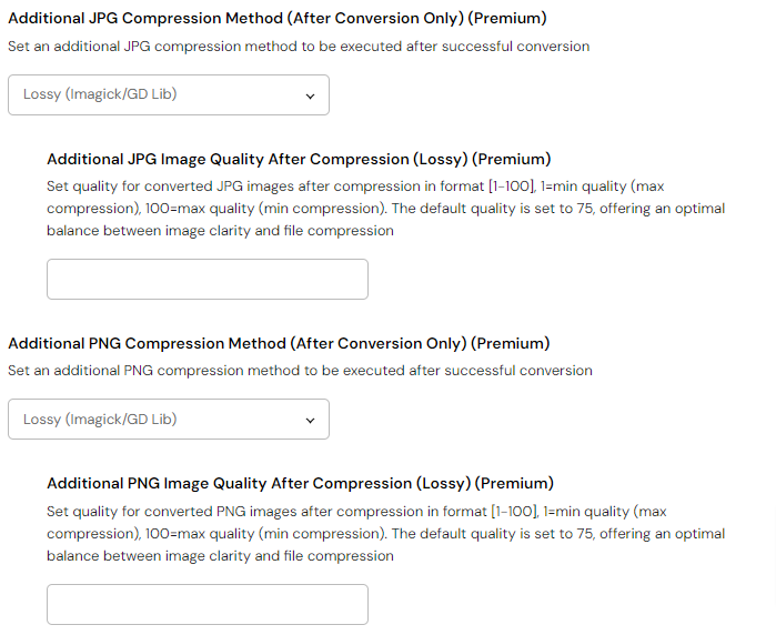 Next up, you can choose an additional compression method for JPGs and PNGs to be applied following the conversion (Lossy (Imagick/GD Lib), Lossless (CL Tools), Lossy (CL Tools)). In addition to this, you can configure the compression quality for Lossy conversion methods.