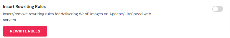 Following this you can insert/remove rewriting rules for WebP images on Apache/LiteSpeed web servers.