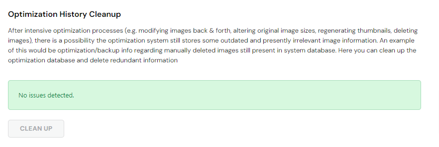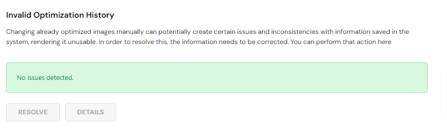 Since images which were optimized manually can potentially cause certain issues and inconsistencies with information saved in the system, this information may need some correcting. If there are any issues detected, you can resolve them here.