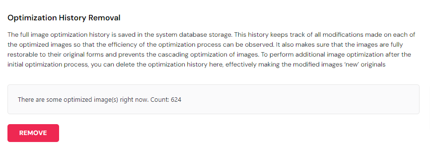 Note that the Optimization History contains all the information regarding the already performed image optimizations and actions taken during the process, and also makes sure all the images are fully restorable to their original forms (this will not be possible after removing the optimization history).