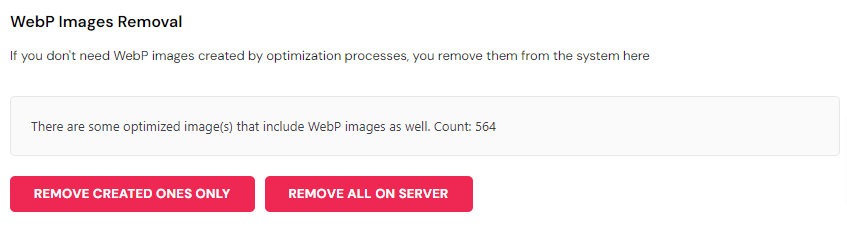 You have the option to remove created WebP images only, or remove all WebP images found on your server.