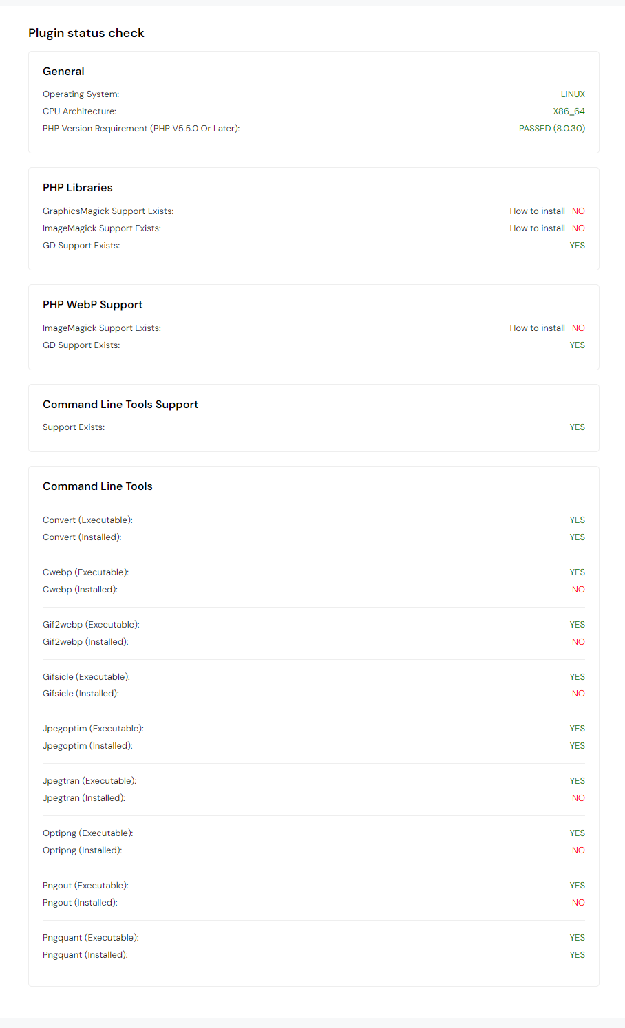This is where are presented with an overview of information partaining to the plugin and its current standing, including General, PHP Libraries, PHP WebP Support, Comand Line Tools Support, and Command Line Tools info.