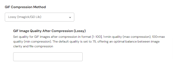 Next up is the GIF compression method, where you can pick from two compression types: Lossy (Imagick/GD Lib) and Lossy (CL Tools), with the same options partaining to compression quality as in the case of JPG and PNG files.