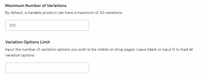 The final set of options found here lets you input the maximum number of variations you wish to show for variable products, as well as limit the number of variations displayed on shop pages.