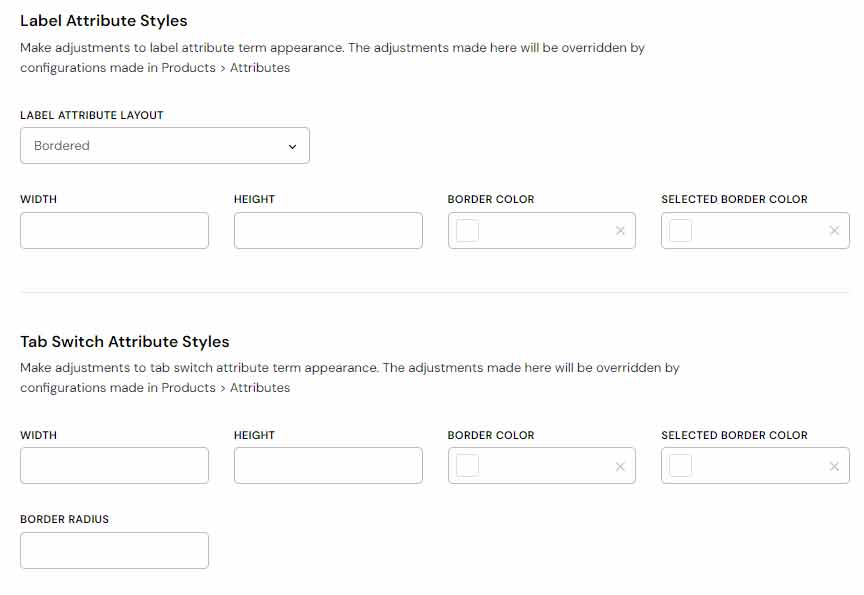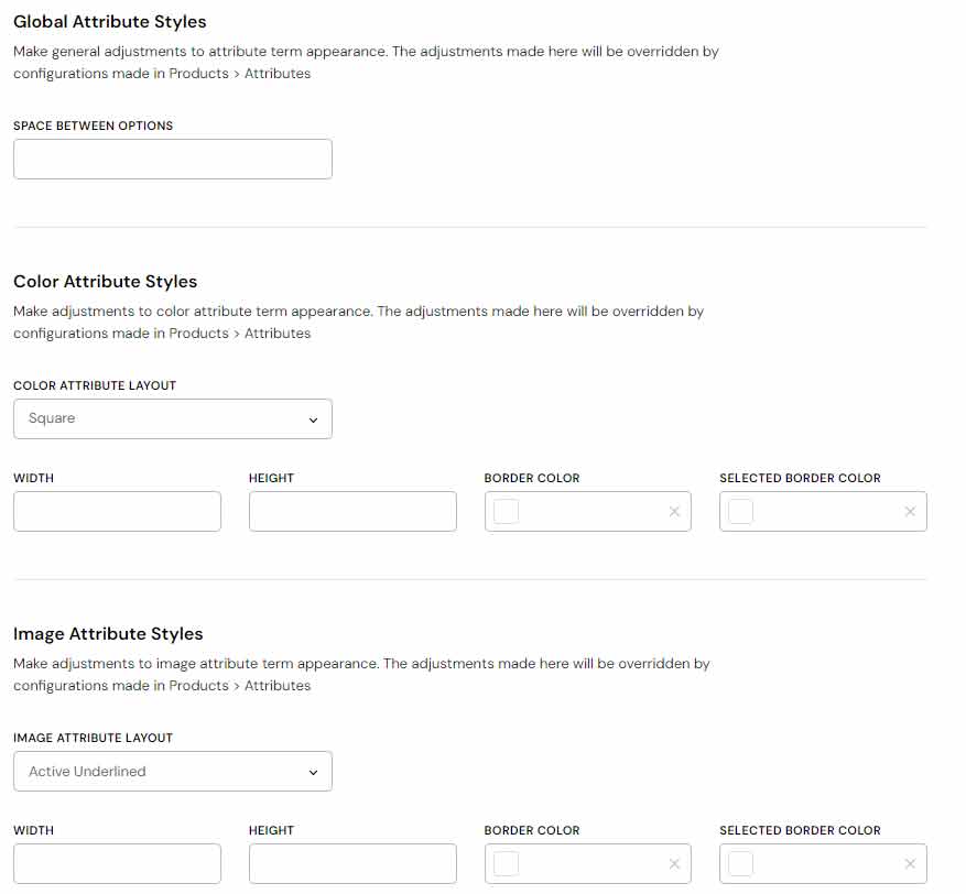 You can also set up variation option width, height, border color, and active border color for each of the attribute types here.