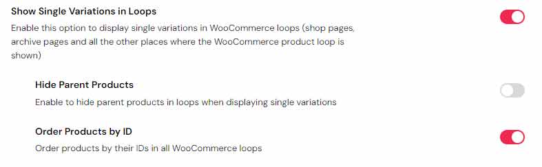 The remaining two options relating to single variations let you choose whether you wish to hide parent products in loops when displaying single variations, and you can also order products by their IDs in all WooCommerce loops.