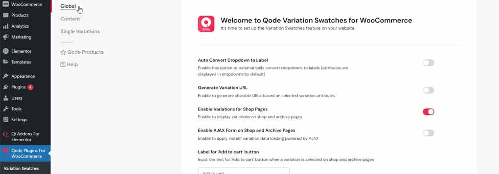 To access these settings, you should navigate to QODE Addons for WooCommerce > Variation Swatches Options > Global.