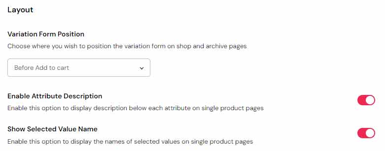 Here you can choose where you wish to position the variation form on archive and shop single pages, enable displaying attribute descriptions on product single pages, and enable displaying names of selected values on product single pages.