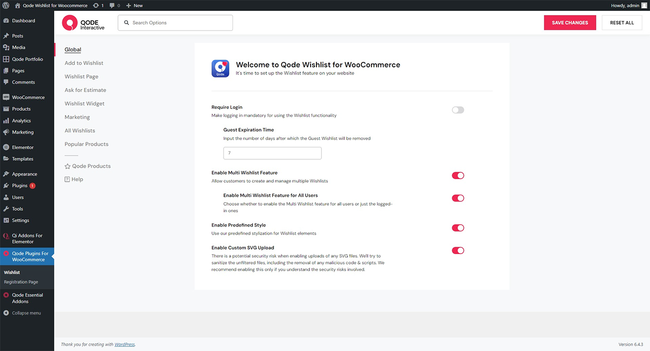 In the following sections of the User Guide you'll find a comprehensive overview of all the settings available in the plugin's QODE Addons for WooCommerce section of your WordPress admin panel once you have installed and activated the QODE Wishlist for WooCommerces plugin.