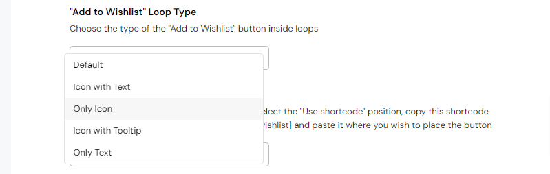 Next up, you can choose a type of the 'Add to Wishlist' button you wish to display in loops (Icon with Text, Only Icon, Icon with Tooltip, and Only Text), and you can choose where you wish to position the button inside loops.
