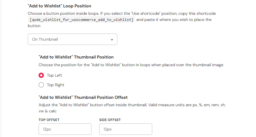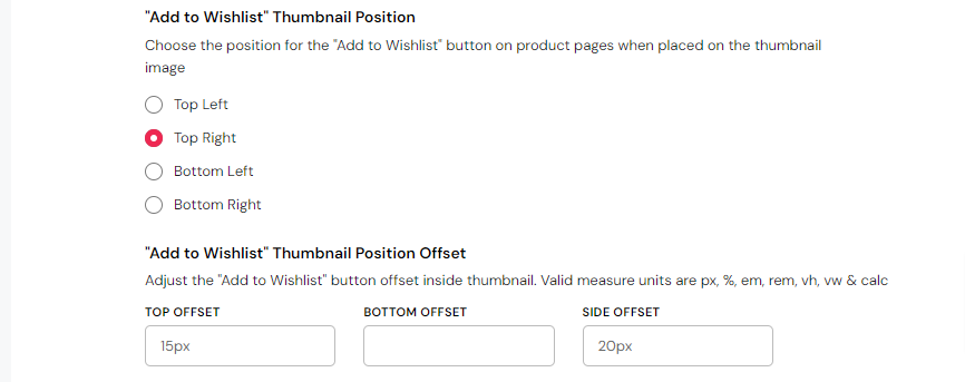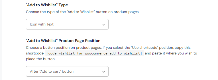 Much like in the case of Product Loop Options, you can choose a type of the 'Add to Wishlist' button you wish to display on product pages, and you can select where you wish to position the button.