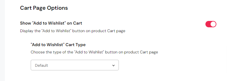This is where you can enable the 'Add to Wishlist' buttons on your cart pages. If you opt to do so, you can also choose a type of the 'Add to Wishlist' button you wish to display on cart pages.