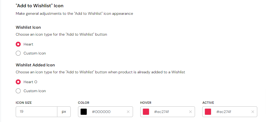 Here you can choose between plugin-defined heart icon for the button, or use a custom icon of your own.You can do the same for the already added products too, as well as set up the icon size, color, hover color and active color.