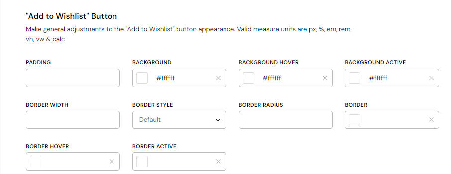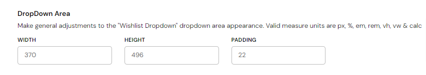 The final set of settings lets you configure the stylization of the Wishlist Dropdown widget. You can alter its width, height, and input values for the widget padding.
