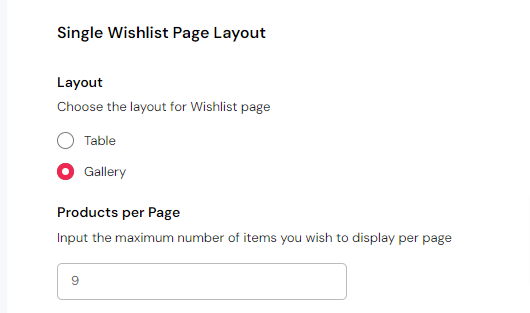 First up, you can choose one of two layouts for the wishlist table: table and gallery. Next up, you can enable improving default table responsive settings for securing a better look and feel on different screens (this option is only available for the table wishlist page layout), and input a maximum number of items you wish to display per page.