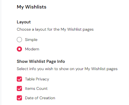 Here you'll find options for adjusting how the users see their owh private wishlists. You can choose one of two personal multi wishlist layouts (simple and modern), and choose whether you wish to display item counts, privacy info, and creation dates.