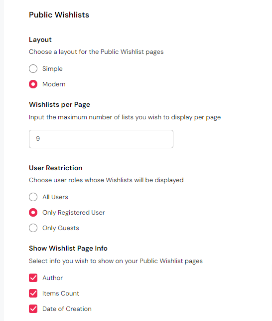 Next up, you can configure the appearance of public multi wishlists. You can choose between simple and modern public wishlist layouts, choose how many items per page should be visible, select user roles whose public wishlists will be displayed, and enable displaying wishlist author names, item counts, and creation dates.
