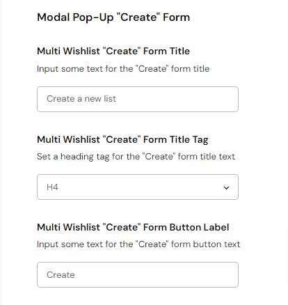 Here you can configure the 'Create' forms for multi wishlist. You have the option to input the form title, set a heading tag for the title text, and input a custom label for the 'Create' form.