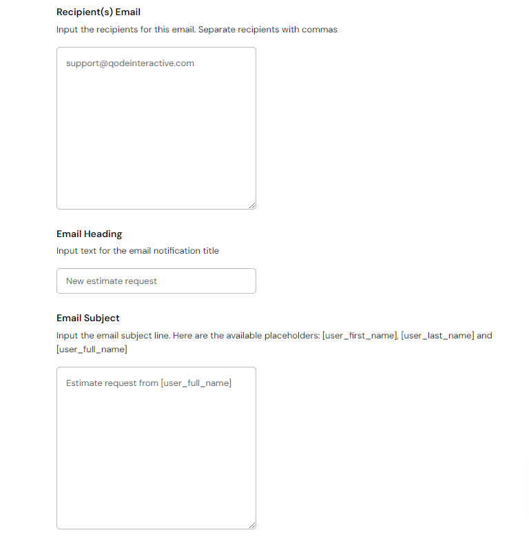 The set of options that follows lets you input the Ask for Estimate form recipient email address, the email heading, and the email subject.