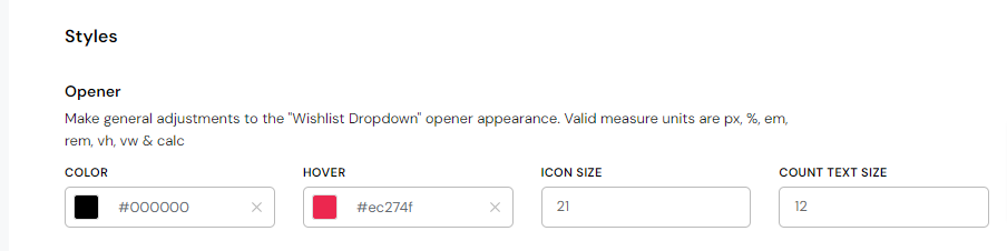 The next set of options in this tab allows you to adjust the style of the wishlist dropdown opener link by setting its initial color, hover color, icon size, and count text size.