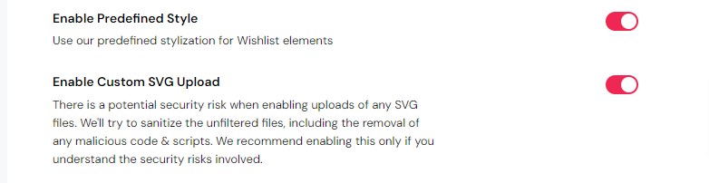 The remaining options let you apply a predetermined, plugin-defined stylization to your wishlists, and finally, you can and enable custom SVG uploads (please make sure you are familiar with security risks involved before doing so).