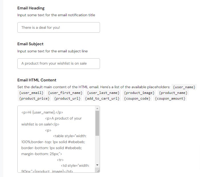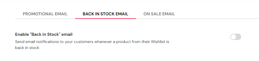 In the following sub-tab, you can enable and set up 'Back in Stock' emails for notifying users when their out-of-stock wishlist items are back.