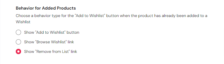 First up, you can choose a behavior type for the button when a product has already been added to a wishlist. You can display an 'Add to Wishlist' button, a 'Browse Wishlist' link, or a 'Remove from List' link for these.
